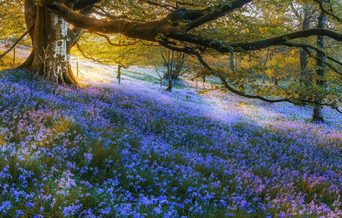 Where a blue-bell carpet covers all the ground beneath their feet,
